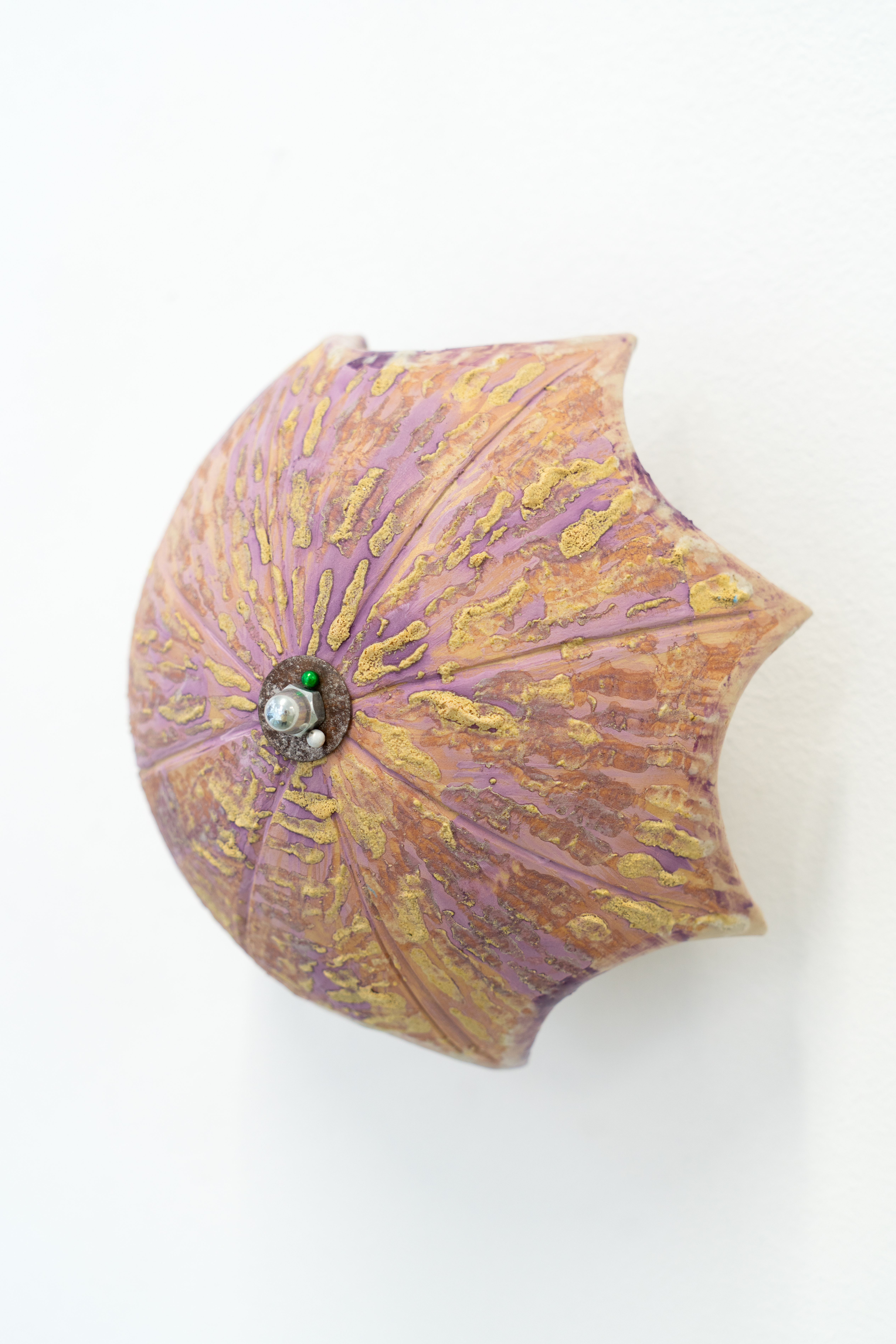 Kin field shield series by Camille Dumond consists of three wall-mounted ceramic sculptures. Extracted from a larger, ongoing series, these three geometrically distinct forms — reminiscent of the artist’s earlier suspended ceramic spheres — evoke thick umbrellas, inverted shelters, or reimagined shields.